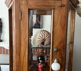 Très belle vitrine en verre bombé confiseur année 70 socle en chêne ,fond miroir,encadrement laiton,très bon état