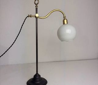 Ancienne lampe de bureau dîte ?monte et baisse? des années 1970 en métal, laiton et opaline. Belle lumière. A noter 2 petites fentes sur le bras sans conséquence pour sa solidité.