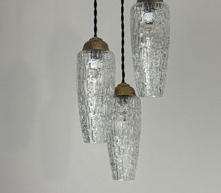 Lustre 3 feux en verre des années 1970. En très bel état. Bel effet de lumière. L'électricité a été refaite. Douille à vis petit culot (Ampoules E14). Branchement par domino.