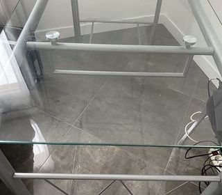 2 bureaux en verre, en très bon état vendus a l'unité,mesurant 1m40x68cm, avec une niche côté gauche, en verre trempé.très solide