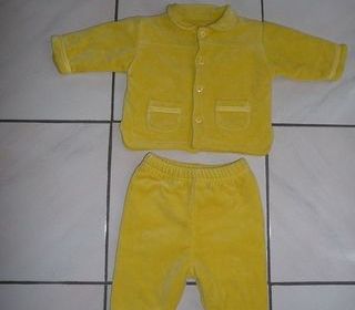 Ensemble velours jaune, bien épais, molletonné, doublé textile coton, extrêmement doux composé de : - Veste : boutonnée devant, 2 petites poches, col arrondi, pans arrondis au b