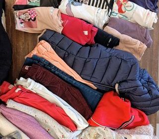 Très grand lot de vêtements taille 6 ans 1 blouson avec capuche bleu marine et rose 1 jean/1 pantalon velours 2 pantalons jogging 1 pantalon abricot 2 robes pull /2 pulls