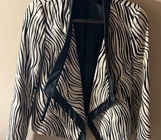 Très peu portée, état impeccable ! impression zèbre , col et poches gansés tissu noir satiné . plus courte derrière, plongeante devant, se porte ouverte, mais rien ne vous empêche