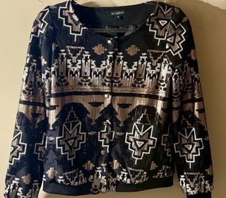 veste façon blouson, pressions . col et bas de manches tissu noir. excellent état, paillettes impeccables, pressions et doublure également. à€ porter l'été avec un pantalon blanc,