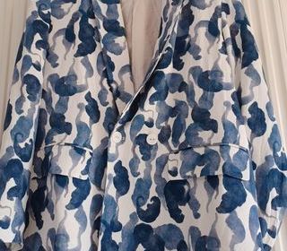 Vends veste femme taille 36 ou s , taille grand , blazer quasi neuf couleur blanc motifs bleu , de marque Zara . 2 fausses poches devant , fermeture bouton blanc, intérieur doublé,