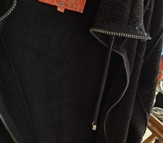 Veste polaire noire, le tour de cou peut être monté très haut et ajusté (2 cordons de serrage) taille 42/44 A récupérer à Cagnes-sur-Mer contre paiement, pas d'envoi