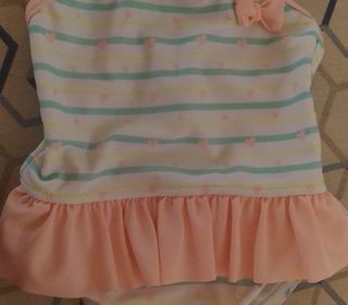 Maillot de bain rose 1 pièce de marque " mes petits cailloux " Rayé bleu, jaune blanc avec petits c?urs rose Maillot 1 pièce pour bébé fille avec volants à la taille. Rayé, i