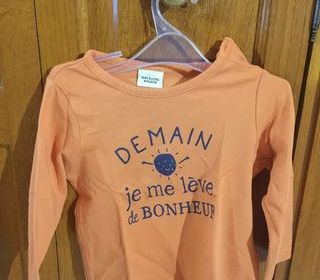 Vends Tee shirt enfant garçon " Tape à l' oeil " à manches longues - Couleur corail / orange - Très bon état - Prix 3 euros