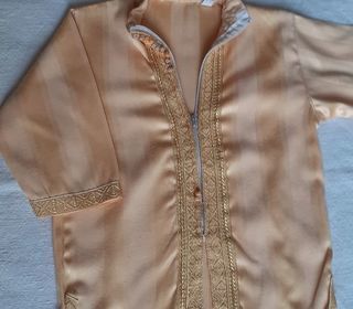 Vends une tunique orientale en coton épais de couleur jaune, fermeture éclair, col officier pour garçon 2 ans