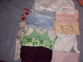 lot de 10 habits été bébé fille 1 mois, composé de : 4 bodies, 2 grenouillères, 1 gilet, 2 robes, 1 pantalon + 3 paires de chaussettes prix : 5€ envoi possible
