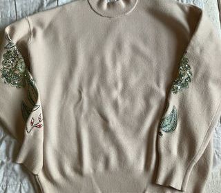 Pull taille M. Excellent état. Desigual. Couleur crème avec broderies sur les manches. 67% viscose et 33% polyester Hauteur 58cm Largeur aisselles 54cm épaules 53cm manche 51