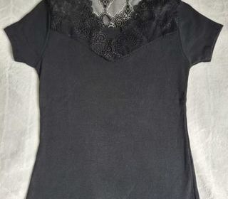 Je vends ce T-shirt femme noir avec détails en dentelle au col. - Type de produit : T-shirt - Univers : Femme - Taille : 38 - M - Couleur : Noir - Caractéristiques : Col V, De