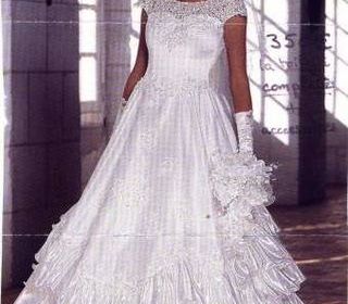 Vends robe de mariée et son jupon à crinoline pour un effet princesse. Elle est en satin blanc, rebrodée de perles, bustier en dentelle, sans manches. Cause de la vente : cérémoni