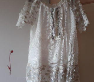 Très jolie et seyante robe courte en tulle blanc et sequins dorés ; Convient pour 1 ceremonie ou u n cocktail ; taille du 38 AU 42 . jamais portée A venir chercher et à essayer