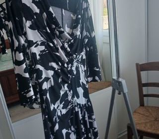 robe noire et blanche, élégante, ,avec empiècement devant plissé ramené sur le côté. col qui retombe devant. manches 3/4 marque "maille girls paris" très bon état.