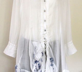 Top long , tunique en lin blanc & bleu MARITHE FRANCOIS GIRBAUD T.L lin 100 % 2 poches pliages origami noués H 90 cm Aiss 50 cm TBE Envoi possible RMP métro Corentin Celton