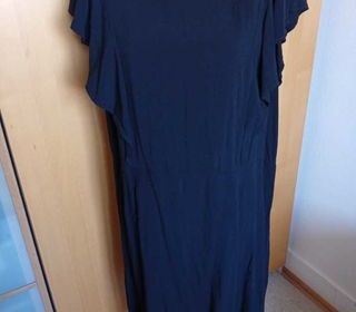 Viscose bleu marine, tissu très doux, imprimé feuille orange, col en V, 2 volants dans le bas, longueur 140 cm, épaules 43 cm, sous-aisselles 55 cm, hanches 58 cm, manches 25 cm. T