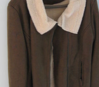 Blouson fausse fourrure soyeuse et impeccable de coloris prune, très belle qualité. T.36-38 - 60cm long 2 poches, fermé par zip devant, col montant, poignets resserrés en élas