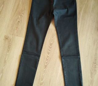 Pantalon femme droit effet enduit noir Taille 40 de marque Caroll ; fermeture par fermeture éclair et bouton marqué Caroll Jeans 1963 ; une vraie poche sur chaque hanche devant