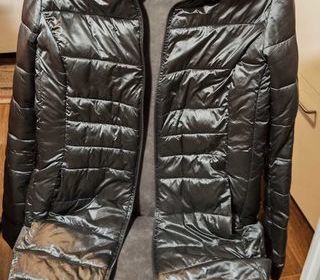 Veste courte capuche réversible COURREGES T. Unique 1 face velours noir viscose 1 face lurex argent 2 x 2 petites poches poitrine bas coulissé réglable fermeture zip H 45 cm