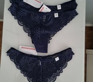 VENDS TANGA DENTELLE Couleur: MARINE Marque; Rougegorge Taille: 38 NEUF avec étiquette Prix :17.90 Vendu 12 euros Pièce
