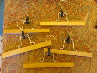 Lot de 5 cintres pinces assortis pour suspendre jupes, pantalons, shorts... En bois clair Longueur d'un cintre : 24,5 cm Très bon état