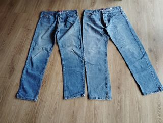 Lot de 2 jeans de marque ROXON de couleur bleu ; coupe droite ((Basic style) ; longueur de jambe (de l'entrejambe au bas du pantalon) : environ 85cm ; sur l'un des 2 jeans :