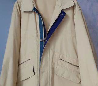 Vends un parka 85 % polyester, 25 % coton, imperméable, 2 poches à rabat, et 2 poches à fermeture éclair plus une poche à l'intérieur, couleur jaune moutarde clair, dessous de col