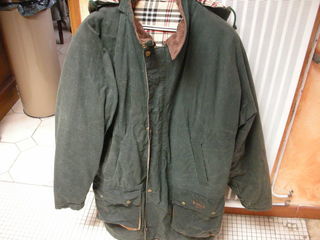 veste de chasse : taille L avec 4 poches à l'avant - 1 poche intérieure Fermeture: fermeture éclair + boutons pressions Aucune déchirure - veste huilée imperméable avec capu