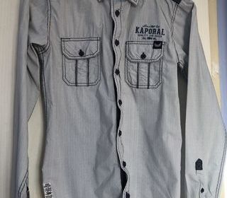 Chemise Kaporal bleu taille 14 ans Fines rayures bleues. Empiècement bleu jean sur le haut du dos et les épaules 2 poches poitrine Bouton sur les manches avec patte à l'inté