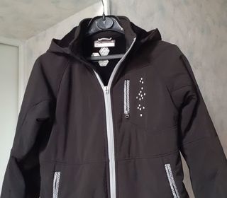 Vends un blouson coupe droite à capuche amovible, 94 % polyester, 6 % élasthanne, imperméable, doublure en fausse fourrure rase, 3 poches zippées, cordons à resserrer à la base si
