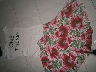 un jupe fleurs rouge un T shirt rose un débardeur rose imprimé 8 euros le tout