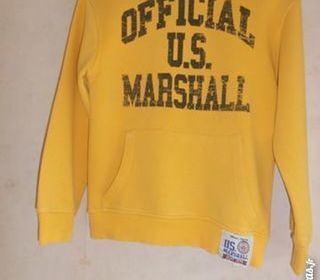 "Très beau sweat à capuche de couleur jaune avec inscriptions noires ""Official U.S. Marshall"" sur le devant, étiquette assortie cousue sur le devant, grande poche plaquée