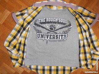 Fermée, c'est une très jolie chemisette à carreaux blancs, gris, jaunes et noirs, ouverte c'est un tee-shirt gris avec des impressions modernes de couleurs blanches et noires.