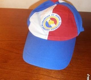 Casquette tricolore Taille 58 cm 100 % coton Ecusson cousu sur le dessus Réglable au dos par scratch Surpiqures bleues Bouton sur le centre du crâne. Excellent état