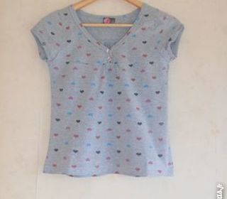 Tee-shirt gris chiné, motifs c?urs multicolores, encolure en terminée par 2 boutons, fronces devant et dans le dos donnent un peu d'aisance, demi-manches, 89 % coton, 14