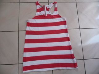 Débardeur à larges rayures rouges & blanches, marque Baltimore League, taille 16 ans, glissière au dos. Longueur : 67-68 cm, largeur : 40 cm. Modèle original. Prix : 8.00 € + fr