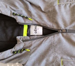 Manteau d'hiver ou de mi-saison à capuche en parfait état de couleur gris clair avec inscription et parties réfléchissantes à la lumière pour une meilleure sécurité. Fermetures int
