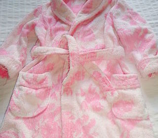 Confortable peignoir en éponge rose et blanc ceinturé 2 poches col châle manches longues avec revers taille 4 6 ans Nous contacter par tel ou par mail Possibilité d'envoi