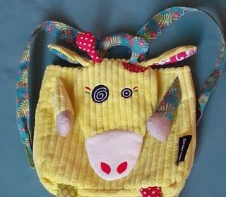 Vends un sac à dos en velours côtelé doublé à l'intérieur, couleur vert/jaune fluo, en bon état pour enfant à partir de 3 ans, marque Los Déglingos. Dimensions : 26 X 24 cm.