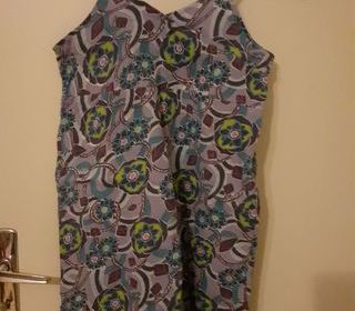Vends une robe en coton et à bretelles de couleur mauve et motifs bleus canard, fronces dans le dos, marque Vert Baudet, taille 9 ans (132 cm).
