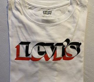 Voici un T-shirt de la marque Levi's de couleure blanche, logo rouge et noir. Tab Levi's apparent en bas à gauche Taille 14 ans N'hésitez pas à m'envoyer un mail pour tout