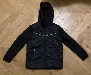 Voici un sweat zippé avec capuche de la célèbre marque IKKS, de couleur noire avec deux poches zippées. Sur la manche gauche, il est brodé : "We are Young" 100% polyester
