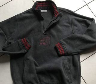 pull polaire BASIC ONE; gris avec des lignes rouge au niveau du col, poignets, et base du pull. MAILLE TRICOT Ouverture par fermeture, col montant, deux poches sur les cotés. P