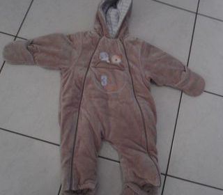 combinaison bébé coloris CHATAIGNE, 6 mois, super chaude, moufles et pieds intégrés à la combinaison ULTRA PRATIQUE, s'ouvre sur les cotés par fermetures,le devant se rabat, ce qu