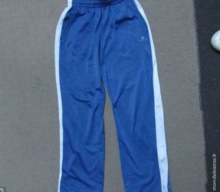 PANTALON DE SPORT BLEU de marque DOMYOS 10 ANS DEUX POCHES SUR LES COTES BANDES BLANCHE SUR LES COTES Bas du pantalon pouvant se resserrer avec stop tout à retirer sur
