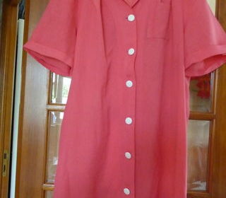 ROBE ROSE FUSCHIA POUR FEMME T46 MARQUE "FRANCOISE DE FRANCE" EN TISSU CREPON A MANCHES COURTES AVEC REVERS , 1 POCHE EN HAUT SUR LA GAUCHE, OUVERTURE SUR LE DEVANT AVEC 7 GROS BO