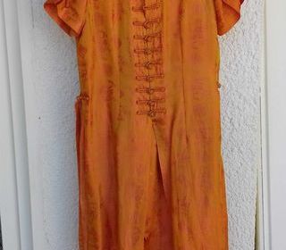 Ensemble en excellent état en satin très léger à porter. Le pantalon a une taille élastique qui serre pas. Jolie couleur orangée