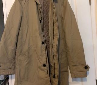 Imper beige avec fermeture boutonnée et doublure matelassée amovible, deux poches latérales, col classique. Taille S