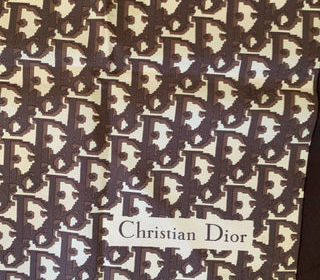 Authentique carré Christian Dior monogrammé Marron beige En soie, ourlet roulé à la main 77 cm sur 77 cm Un très léger éclaircissement sur un bord, très peu visible qui parti